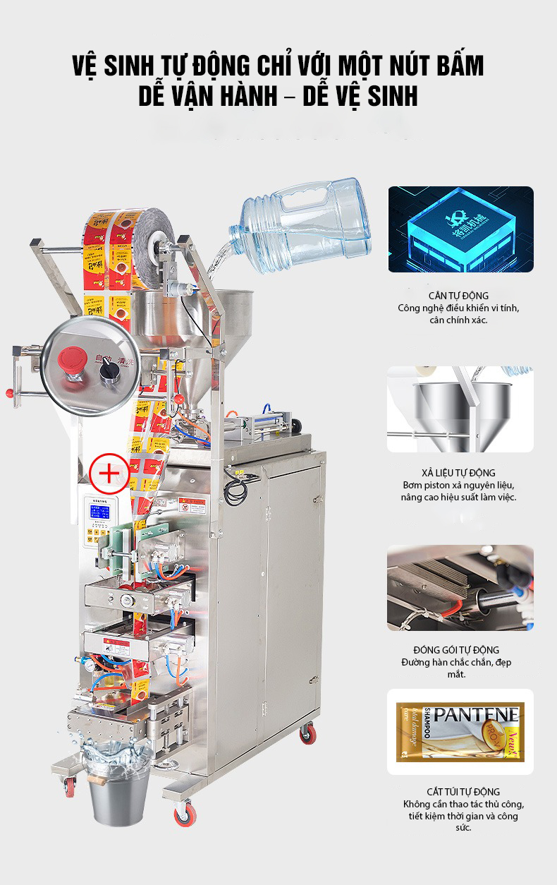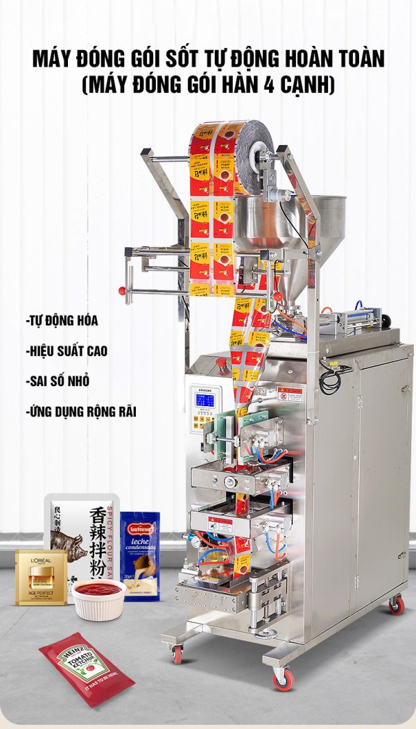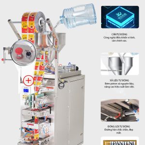 Máy đóng gói dung dịch túi 4 biên (ĐGĐP-P61) là loại máy tự động được thiết kế để đóng gói các sản phẩm dạng lỏng hoặc sệt vào túi có 4 đường hàn kín ở bốn cạnh (trên, dưới, trái và phải). Đây là một giải pháp đóng gói chuyên nghiệp và hiệu quả, đặc biệt phù hợp cho các sản phẩm cần được bảo quản tốt và có tính thẩm mỹ cao.