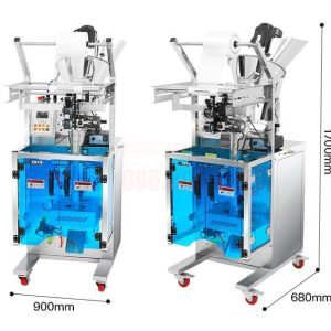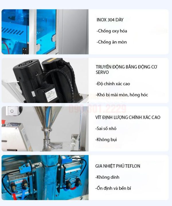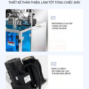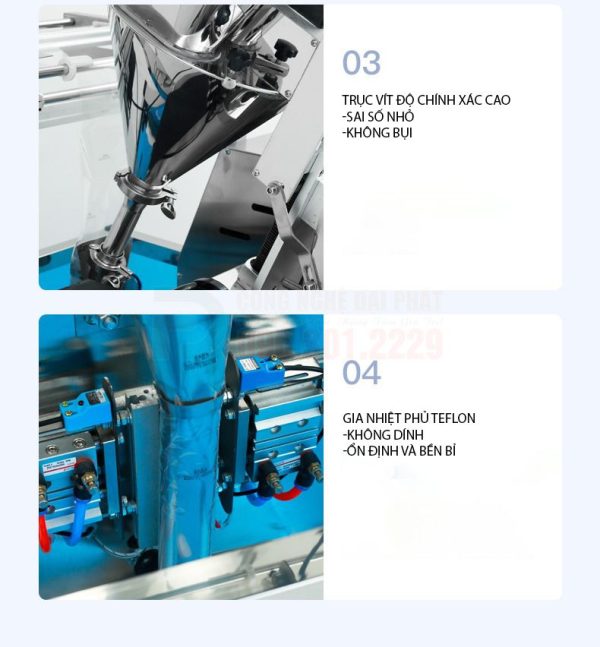 - Bộ phận tạo túi và hàn kín (tích hợp): Sau khi sản phẩm được định lượng và xả xuống, máy sẽ tự động tạo túi từ cuộn màng, hàn kín miệng túi và cắt rời.
