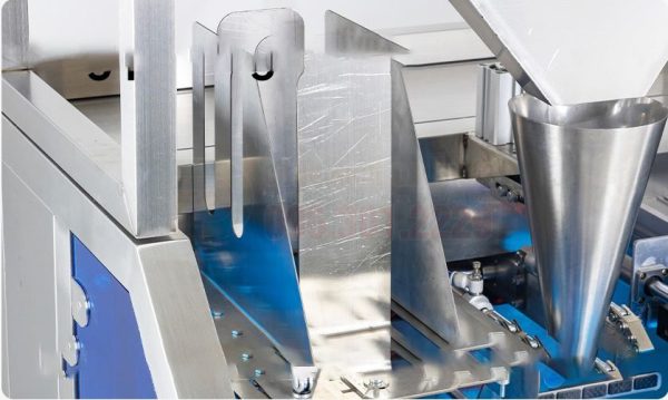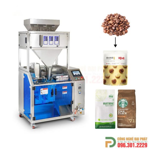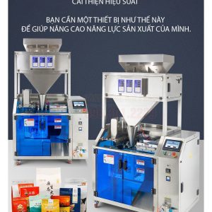 - Định lượng sản phẩm: Hệ thống định lượng (có thể là cân điện tử, trục vít hoặc piston) sẽ đo lường một lượng sản phẩm chính xác và đổ vào túi.