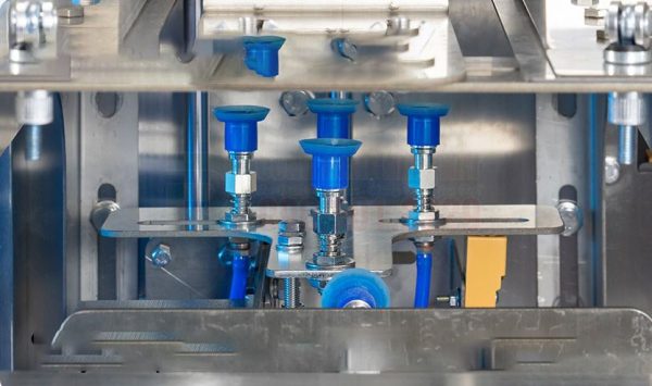 - Định vị: Túi được đưa đến vị trí dưới vòi chiết rót hoặc cửa xả của hệ thống định lượng.