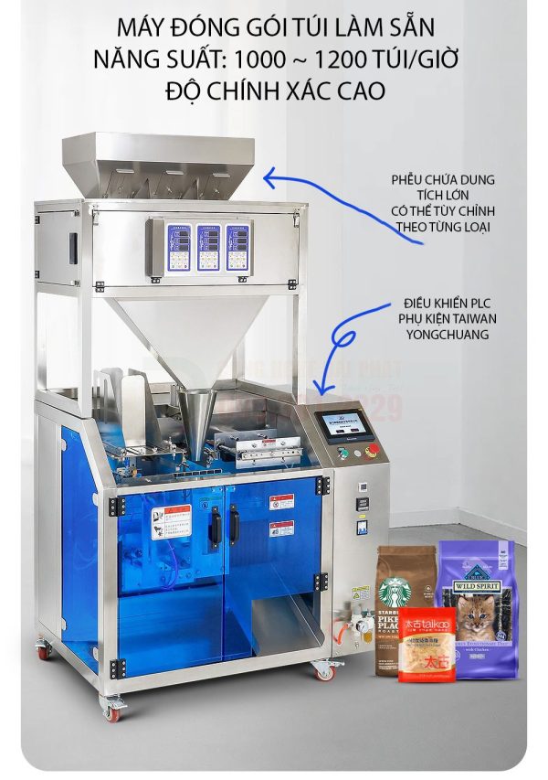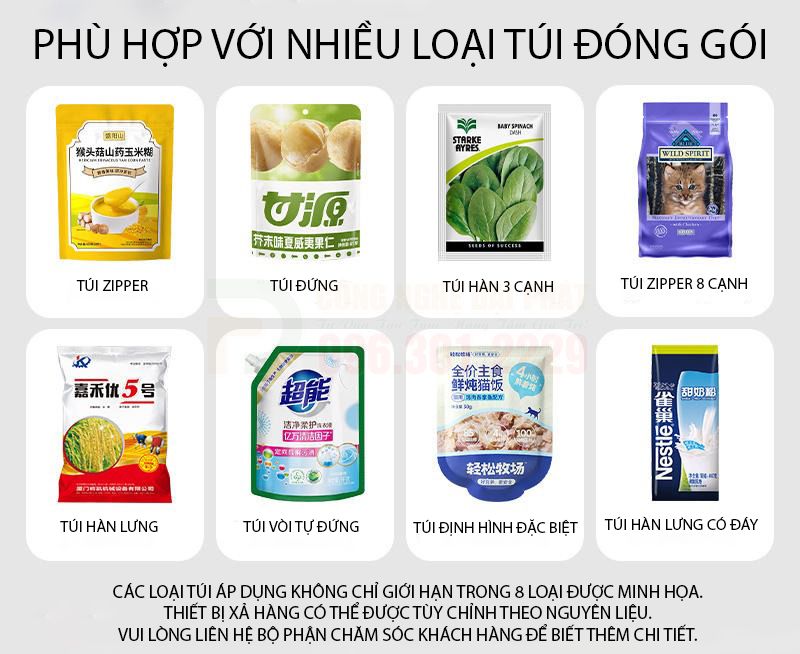 - Tính linh hoạt cao: Có thể sử dụng nhiều loại túi với kích thước, hình dáng, và chất liệu khác nhau (túi zipper, túi đứng, túi giấy, túi màng nhôm…).