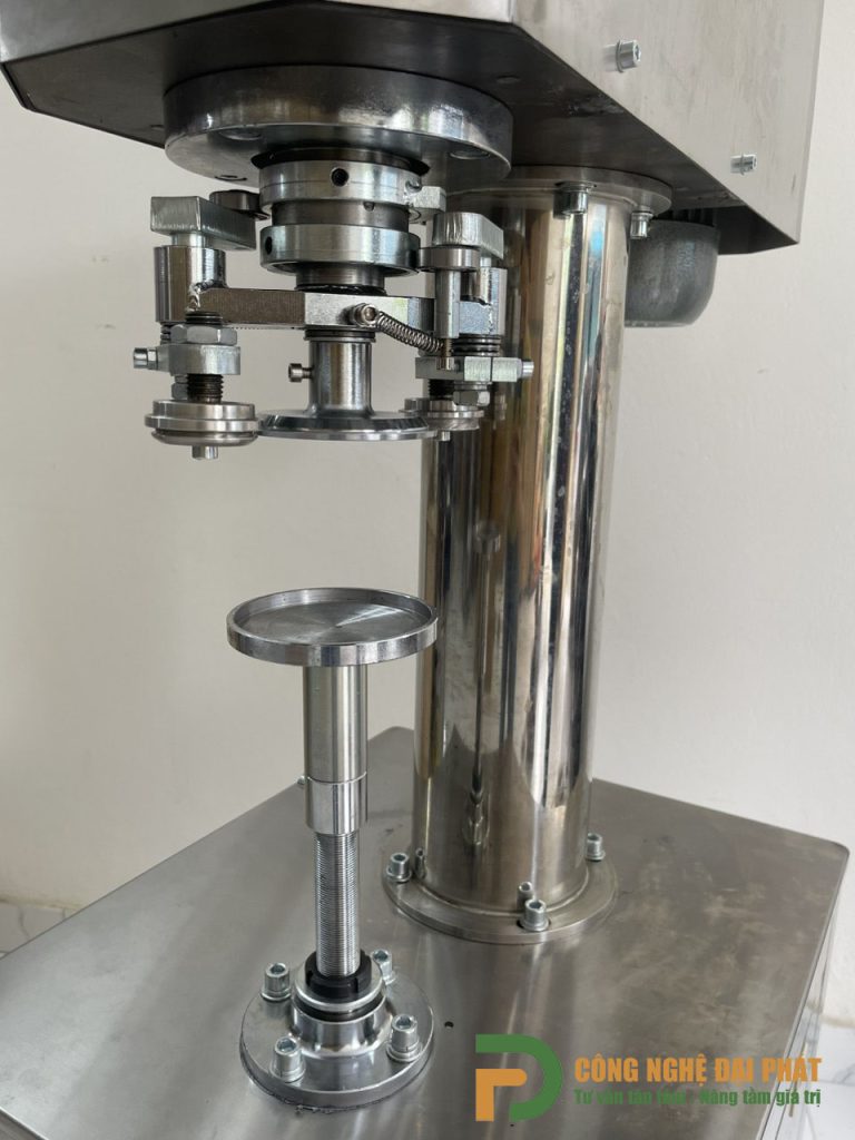• Ép chặt: Đế đỡ (Base Plate) được động cơ nâng lên, ép chặt lon và nắp lon vào Trục ép (Chuck) ở phía trên. Lon được giữ cố định theo chiều dọc và bắt đầu quay (trong máy quay). Lực ép này phải đủ mạnh để giữ lon ổn định và không rò rỉ.
